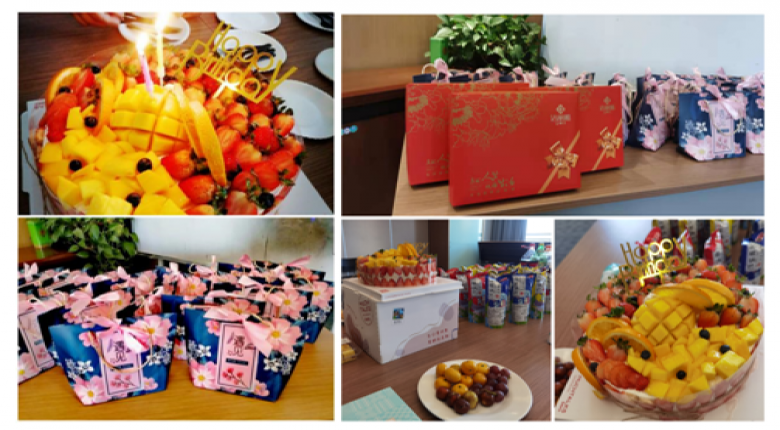 精心准备的生日蛋糕、精致点心、特色饮品和新鲜水果,每一样都为生日会增添一份暖意,每一样都承载着公司对员工的关怀和祝福。